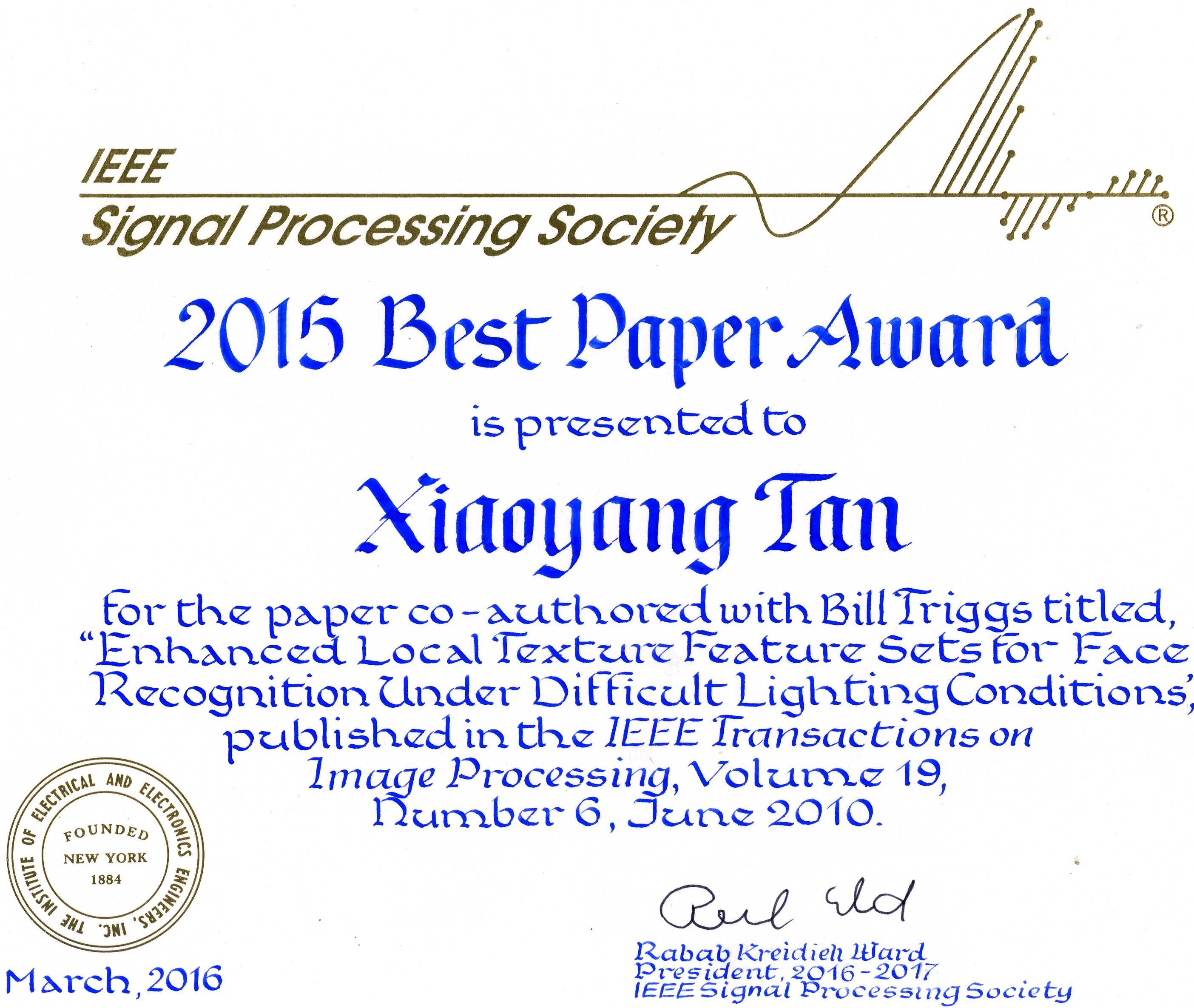 该奖项遴选自IEEE SPS 下属IEEE Transaction期刊及信号处理相关学术期刊于2010年到2015年期间发表的所有学术论文,以表彰其所取得的“罕有好成绩”(Exceptional Merit)。谭晓阳教授于2010年发表于IEEE Transaction on Image Processing的期刊论文“Enhanced Local Texture Feature Sets for Face Recognition under Difficult Lighting Conditions”获得该奖项。该论文还入选了ESI高被引论文。
