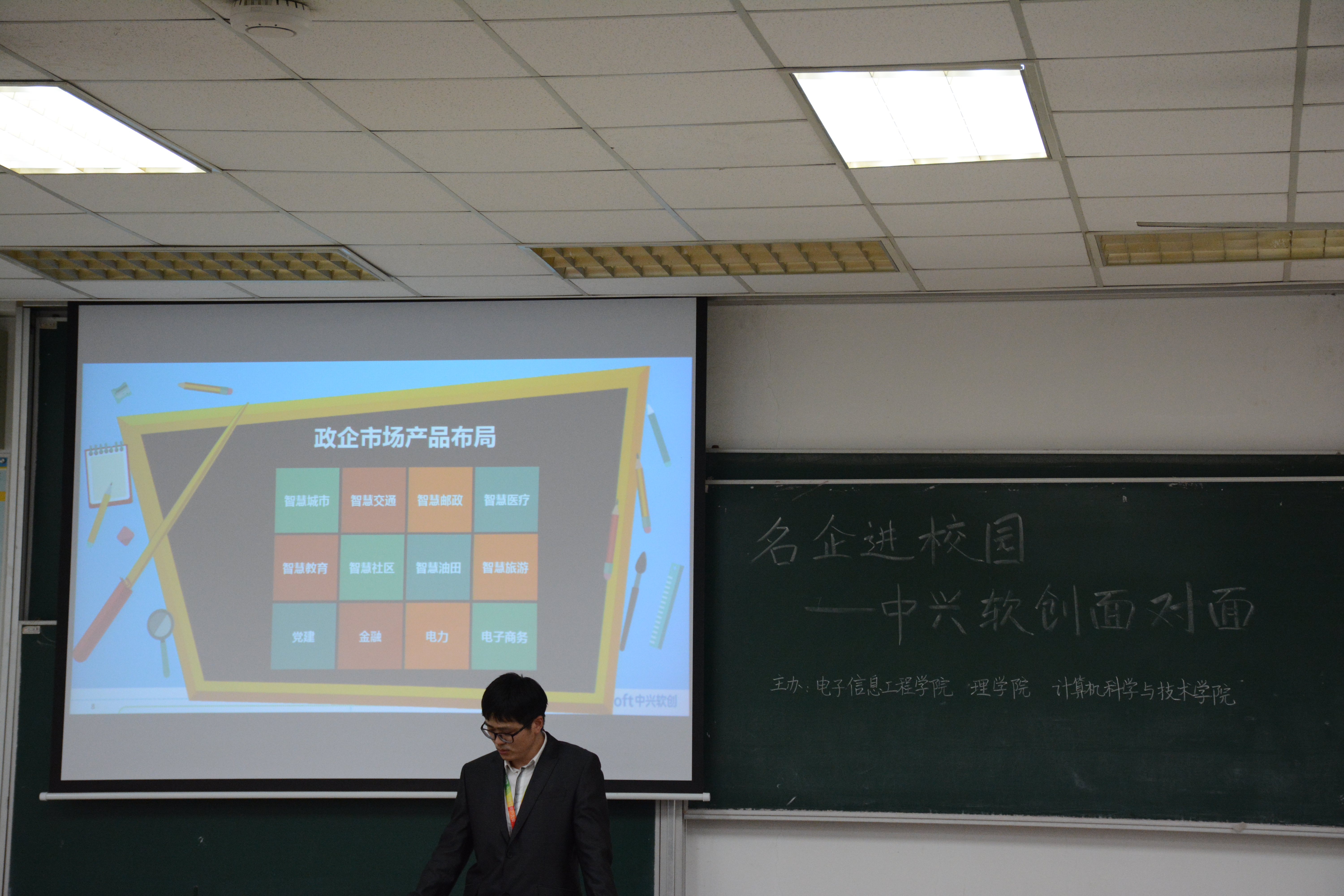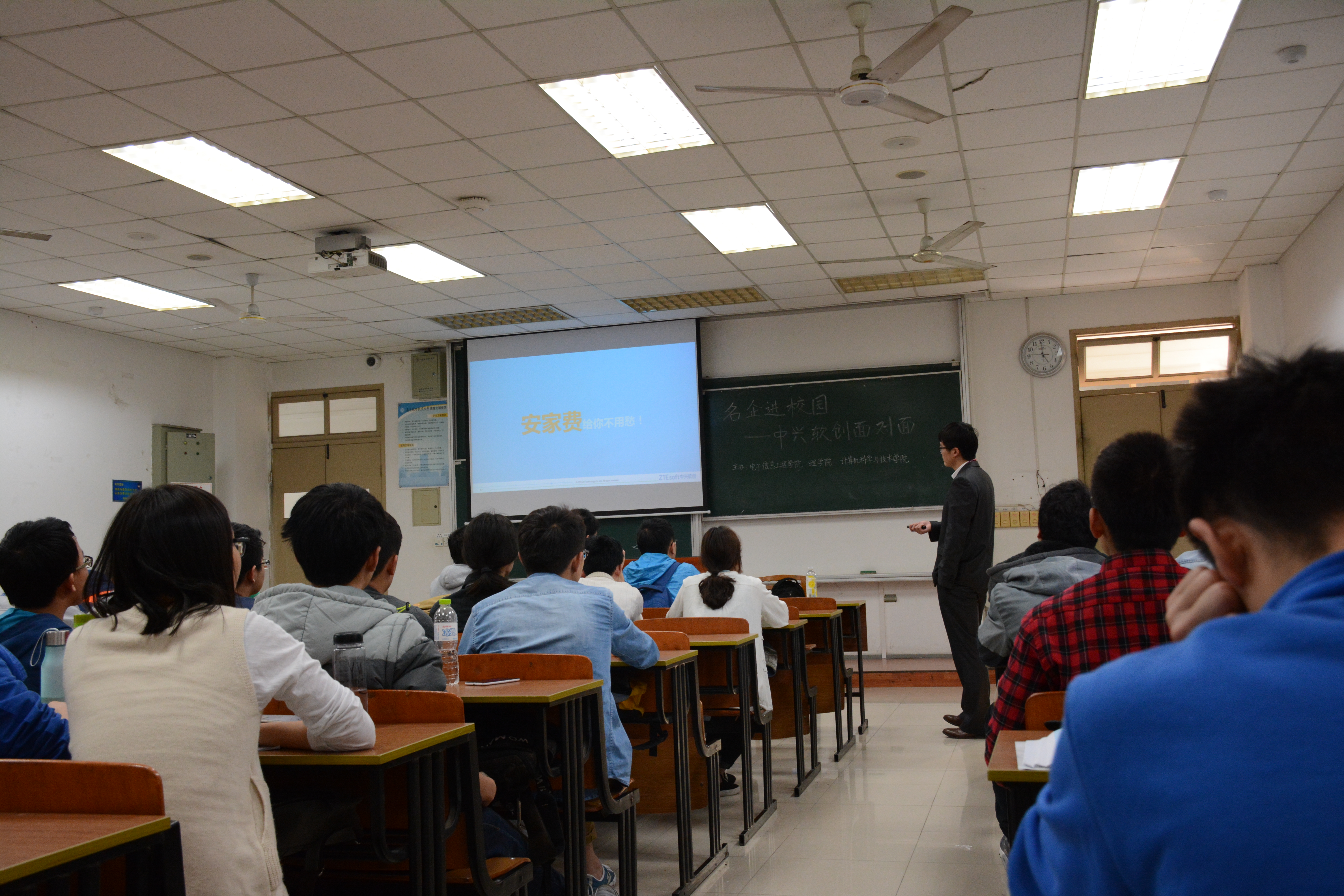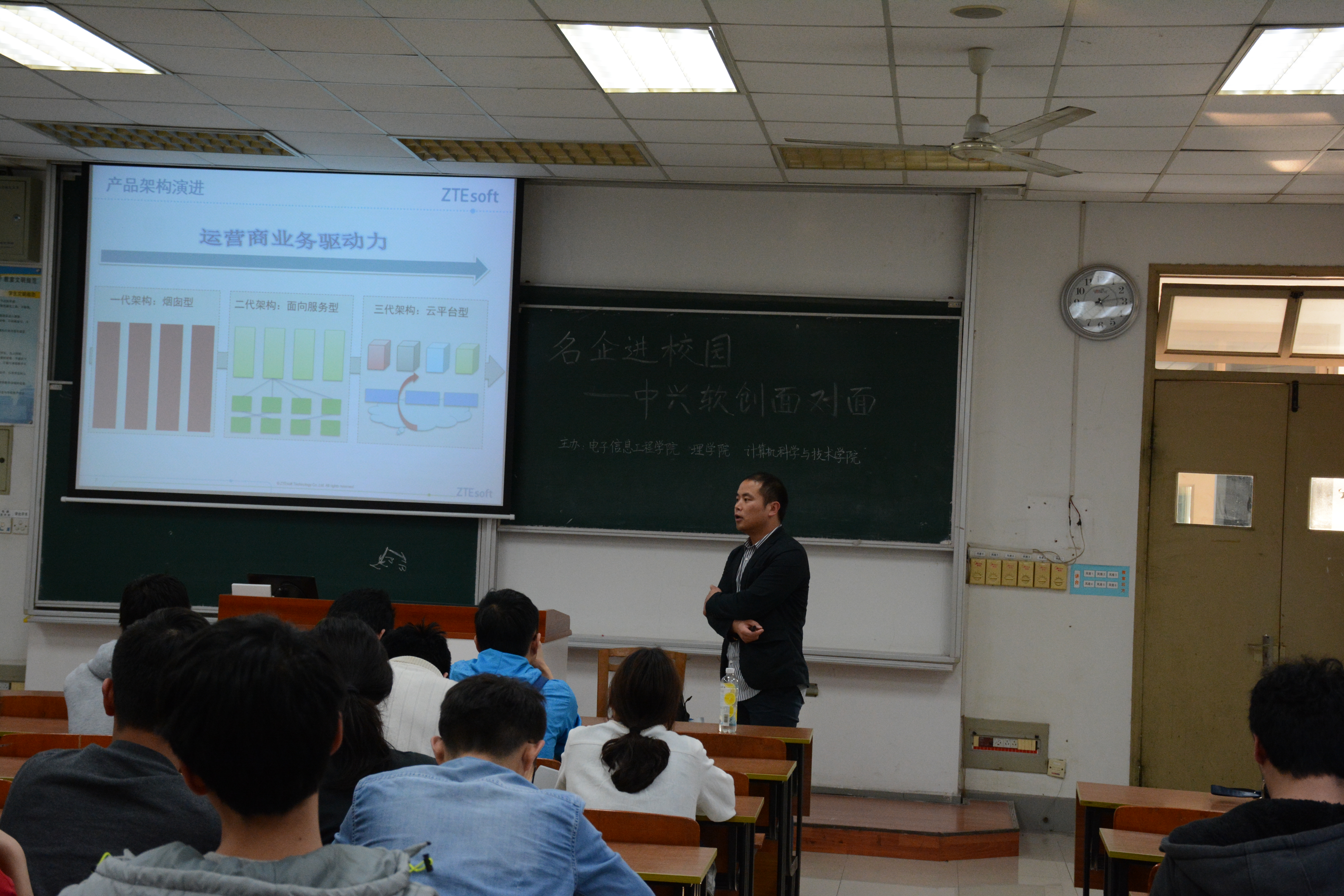 4月28日下午,在将军路校区6102教室,中兴软创人力资源部的李超和技术部专员龚向飞来到我校开展“企业文化先知道”面对面宣讲交流会。我院本科三年级和研究生二年级的近百名学生参与了本次活动,活动还吸引了来自电子信息工程学院和理学院的数十名学生。