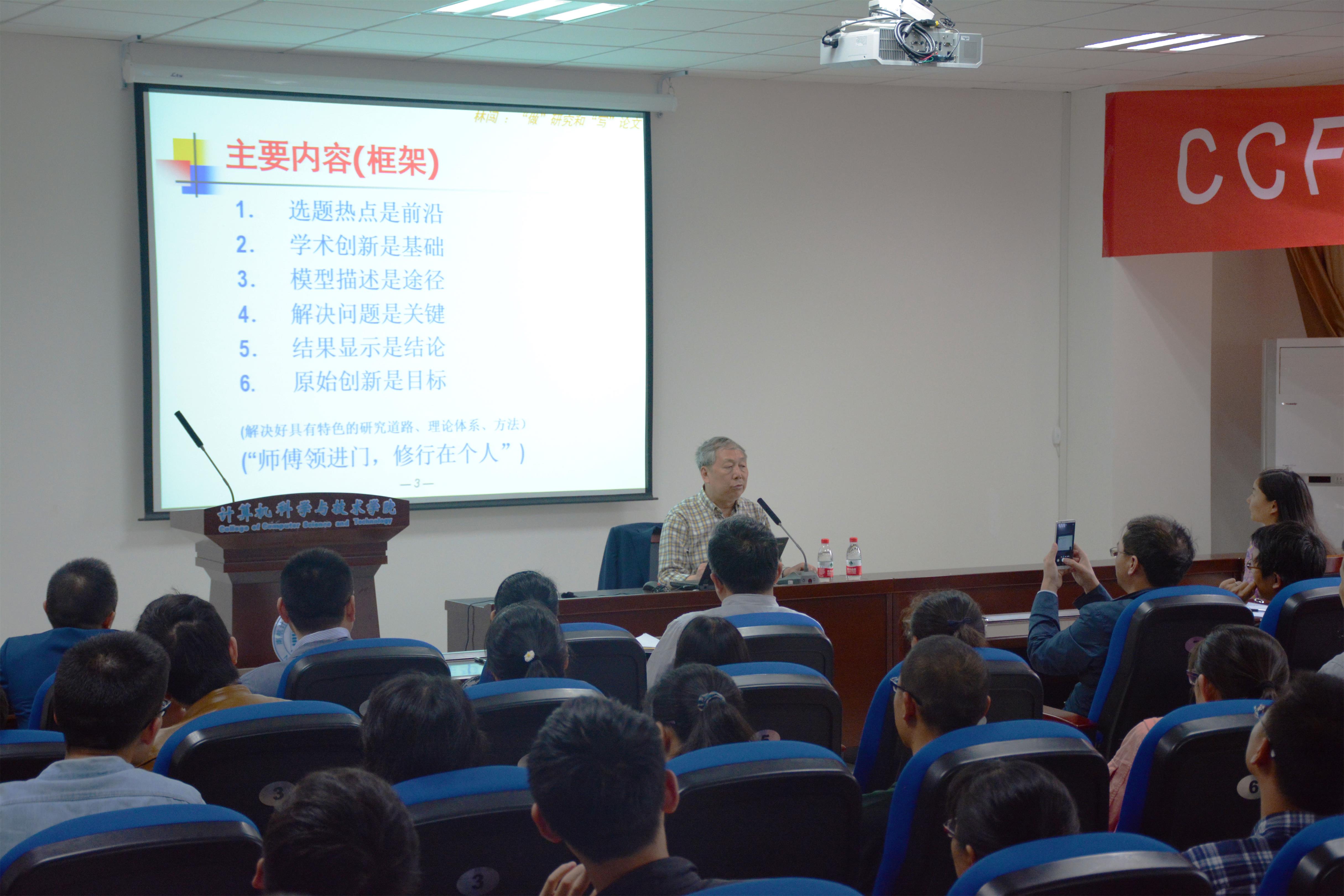 讲座中,林闯教授从西方自然科学认识观和东方辩证思维出发,引经据典,并结合自己做研究和写论文的经历,重点介绍研究层次、形式化方法、学术创新、思维方法,以及论文要求等方面的体会,幽默风趣又有深度的讲座内容深深吸引着在座的师生。林闯教授指出,研究的框架为“理解、性质、效率、实现”,学术创新的方法有“读、问、学、思、试”,他对研究的独到见解令人受益匪浅。