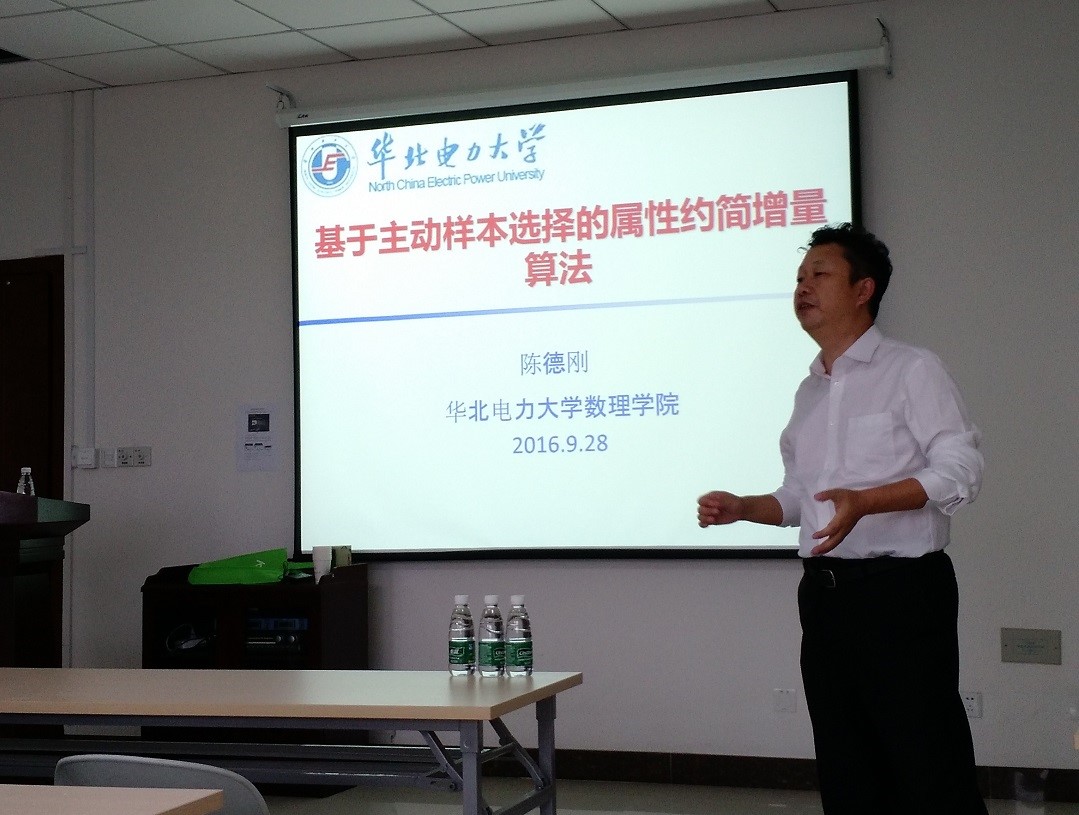 陈德刚教授介绍了其团队近年所提出一种新的属性约简的增量方法,基于极小元素计算属性约简的基本理论与方法,针对动态数据集提出了样本过滤的思想,把添加的样本分成有用和无用两部分,删掉无用的,只把有用的样本从来进行属性约简的增量计算。针对有用样本,提出了从目前的约简集合中删除属性和增加属性的准则,以此为依据设计了基于主动样本选择的属性约简增量算法。陈德刚教授的报告不仅使同学们了解了属性约简的理论背景,而且使同学们更加清楚地了解了属性约简在机器学习领域的应用。报告期间,老师和同学们积极向陈德刚教授提问,对粗糙集理论、属性约简、增量学习等问题开展了进一步的交流和讨论。