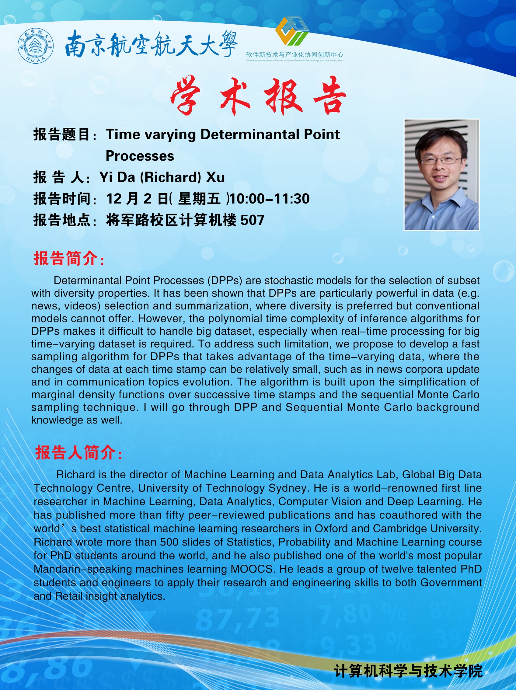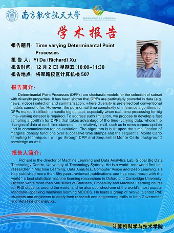 【学术报告】Yi Da(Richard) Xu:Time varying Determinantal Point Processes