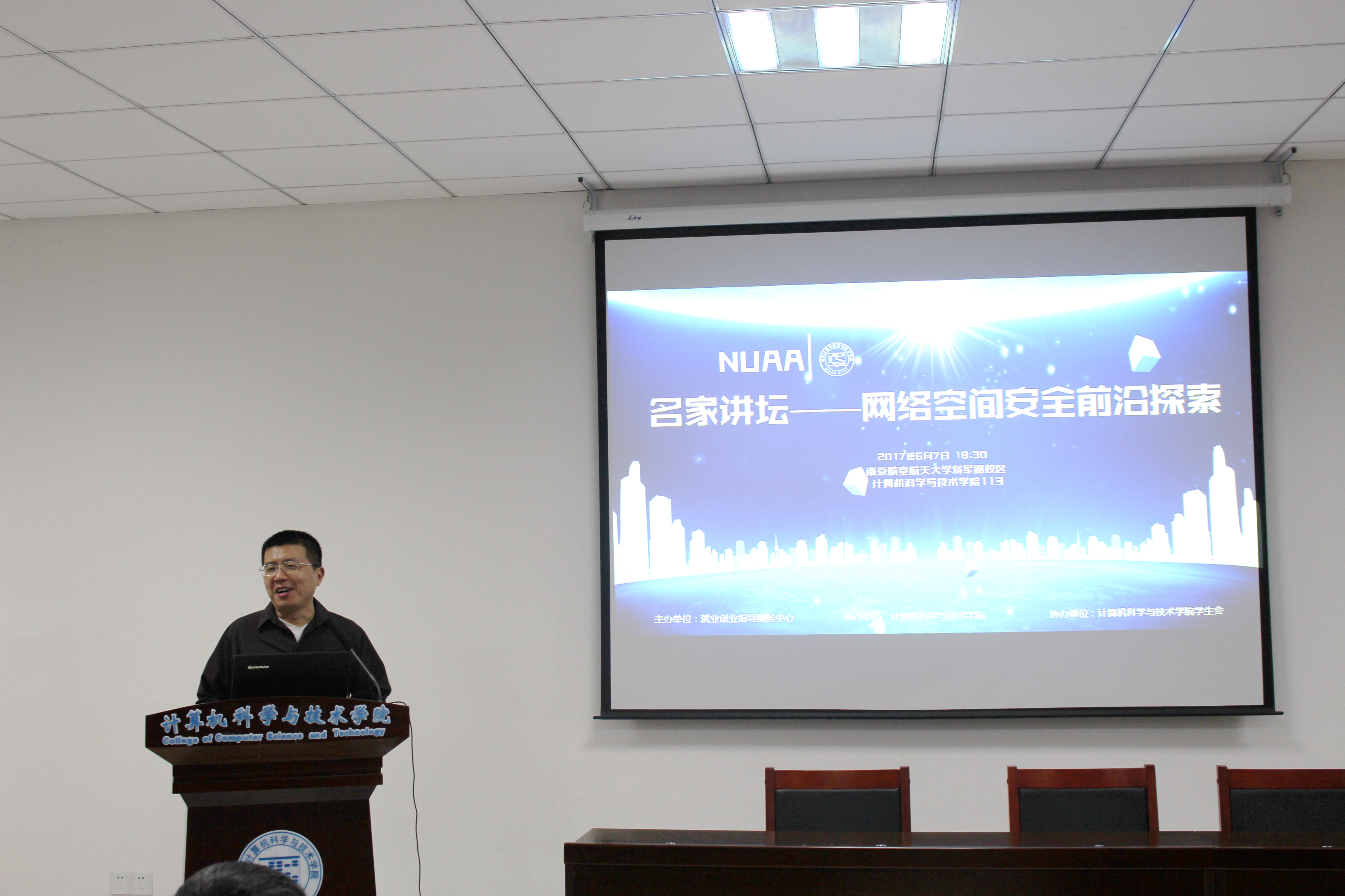 2017年6月7日晚,名家讲坛之“网络空间安全前沿探索”在计算机学院报告厅举行,由南京大学仲盛教授主讲。学院院长陈兵、院党委副书记王霄及学院近200名学生参加了讲座。