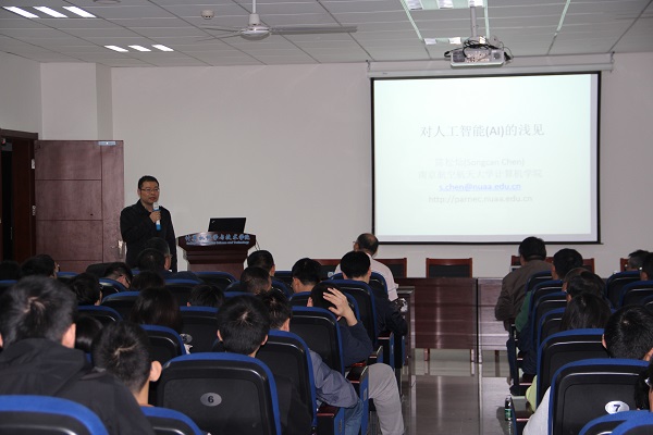 会上,科研院邀请了无人机与人工智能领域专家教授相继做报告交流。首先由计算机学院陈松灿教授介绍了人工智能的发展历程、重要技术与应用前景、当前的局限和挑战,以及我国人工智能的发展目标;随后,计算机学院陈鸣教授汇报了关于无人机蜂群的相关理论与技术挑战;接着,自动化学院徐贵力教授讲解了面向无人机的光电感知技术;盛守照教授探讨了无人机智能化的现时技术瓶颈与思考;李春涛副研究员分析了智能飞行控制技术的机遇与挑战;彭聪副研究员综述了人工智能之计算机视觉进展情况;最后,材料学院汤晓斌教授展示了基于无人机平台与人工智能的放射性监测系统研究。参会教师认真听取各位教授的精彩汇报,结合自身工作研究领域积极向教授提问,开展进一步的交流和讨论。