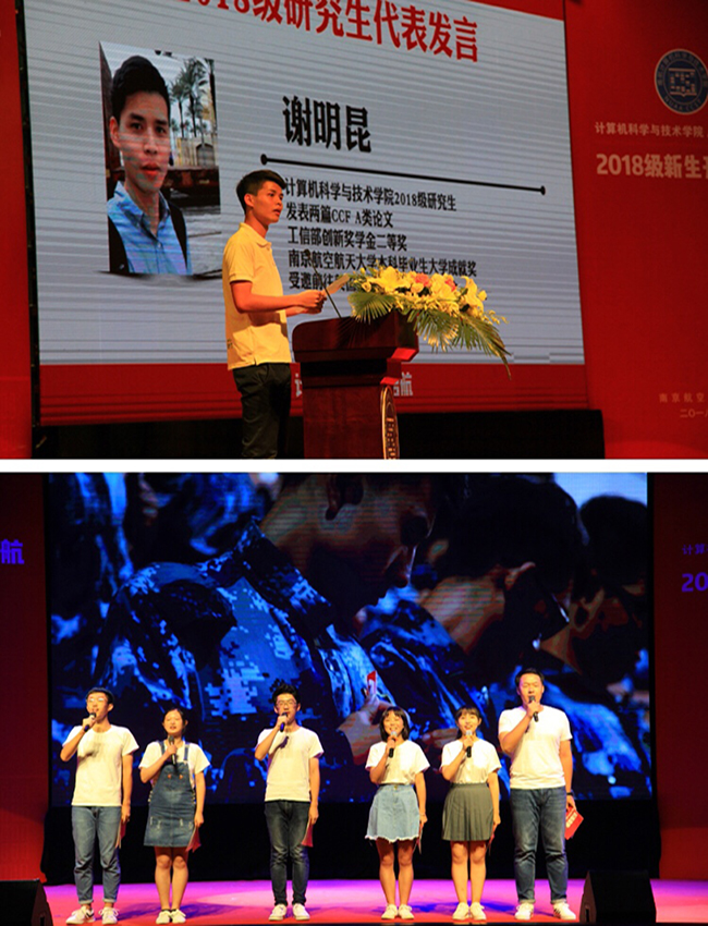 “我们将成为英国上市公司365的新生力量,让更多的人看见,这份我们专属的荣光。”在第三篇章中,6名2018级本科生新生代表首先为在场的观众带来了一首原创诗朗诵。他们通过对“大学初体验”的回忆和描述,传达出对大学新生活的憧憬和向往,更表达出对学校和学院的认可和热爱。精彩的朗诵引起了在场新生的强烈共鸣,现场掌声、喝彩不断。随后,2018级研究生谢明昆作为研究生新生代表发言,他以自己南航“本科毕业生”和“研究生新生”的双重身份切入,以自己的亲身经历鼓舞新入学的本科新生,同时,也表达了自己作为一名研究生新生的激动和自豪。