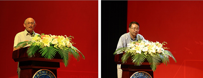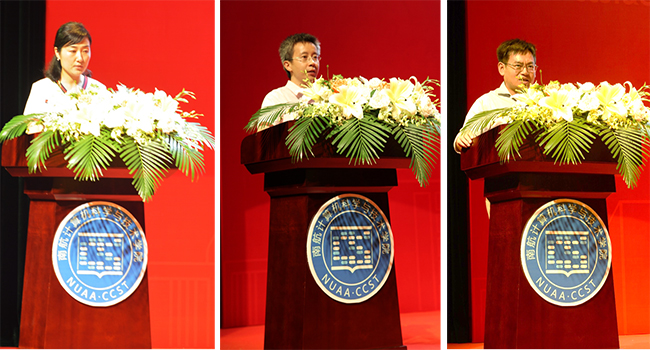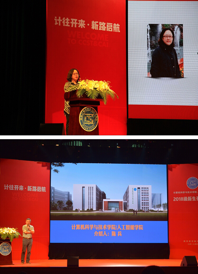 在第二篇章中,教授代表、班主任代表及两位分管本科、研究生教学的副院长分别发言,为新生未来的发展加油鼓劲。陈松灿教授作为教授代表,从自己的求学经历入手,勉励同学们要保持天然的求知欲,把有限的时间花在有用的知识学习上;要勤奋和忠诚,积累知识,并不忘初心,执着于自己的理想。2018级本科生班主任代表周宇老师寄语新生,勉励同学们在新环境下,不忘初心、不念过往、不惧将来,自律、自强、自信,在南航遇见更好的自己。此外,学院部分教师代表也通过视频为2018级新生送上了美好的祝福,希望他们珍惜大学时光,在未来的学习生活中不断提升自己,实现自己的人生目标。最后,副院长孙涵和副院长燕雪峰分别寄语2018级本科、研究生新生。孙院长希望同学们从小我走向大我,能够拥有远大的理想、恰当的学习方法和持之以恒的坚韧毅力。燕院长以诙谐的语言讲述了自己的求学经历,并要求研究生们潜心求学、勇于探索、注重学术诚信、多与导师交流探讨,珍惜研究生宝贵的学习时间,努力成就更好的自己。