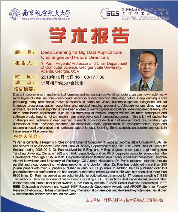 【学术报告】Yi Pan:Deep Learning for Big Data Applications Challenges and Future Directions