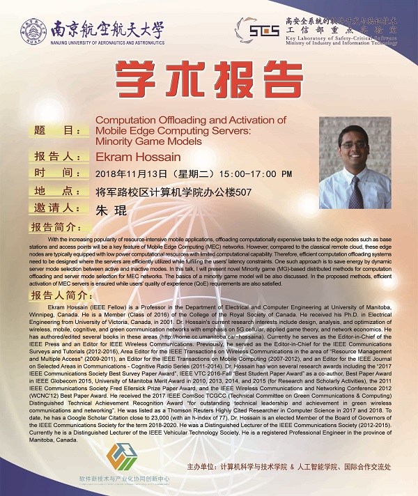 【学术报告】Ekram Hossain:Computation Offloading and Activation of Mobile Edge Computing Servers: Minority Game Models