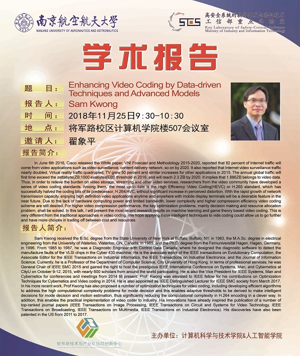 【学术报告】Sam Kwong:Enhancing Video Coding by Data-driven Techniques and Advanced Models