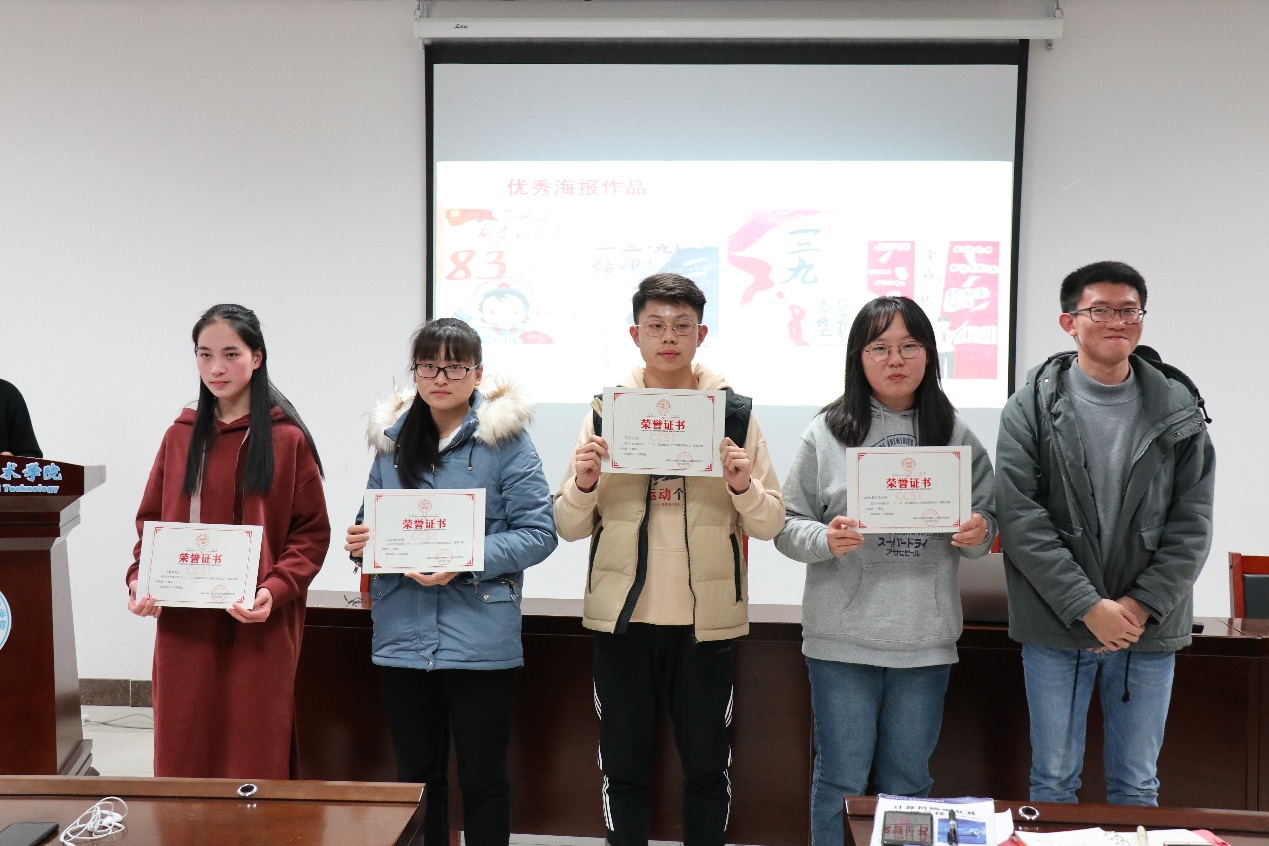 接下来,学院团委为同学们精选了一部中国近现代史电影节选,讲述了中国由弱转强的进步史。当看到当年的学生们、战士们为国挺身而出,看到士兵们流血牺牲,看到新中国的成立,看到我国国力终于强大到能在世界拥有了话语权时,同学们心中激荡着的是满腔的感动与自豪!在颁奖仪式中,2018级辅导员胡朋为此次“一二九”爱国主义教育系列活动中获得优秀素养公开课和优秀海报的团支部颁发了获奖证书。