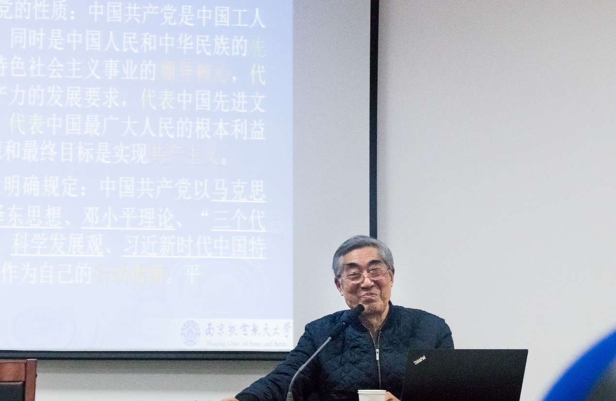 丁荣茂从当代青年党员的责任担当切入,围绕党旗、党徽、中国共产党章程、入党誓词介绍了中国共产党的性质与指导思想,深刻剖析其中的内涵。结合历史,丁荣茂讲述了从1840年到2050年期间中华民族的复兴之路以及在关键时间上发生的重大历史性意义事件。围绕中国梦,丁荣茂详细阐述了中国特色社会主义追梦之路,他以习近平总书记在2019年新年贺词“我们都在努力奔跑,我们都是追梦人”来鼓励广大同学不忘初心,勇于追梦,做一个在新时代下努力奔跑的追梦人。随后,丁荣茂结合自己当年的入党故事,分享了自己当年入党时写的诗:“溧阳山区老乡家,展开党旗壁上挂。拨亮油灯举起拳,宣誓永听党的话”,赢得了同学们热烈的掌声。