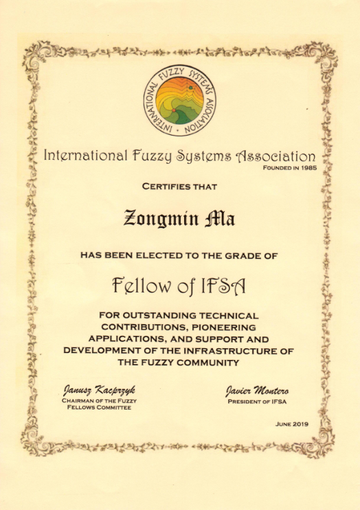 马宗民教授取得的丰硕科研成果在国际上产生了广泛影响,此次授予马宗民教授IFSA Fellow证书,以表彰他在应用领域的先驱性工作以及对模糊领域基础结构建设的突出贡献和广泛国际影响力。