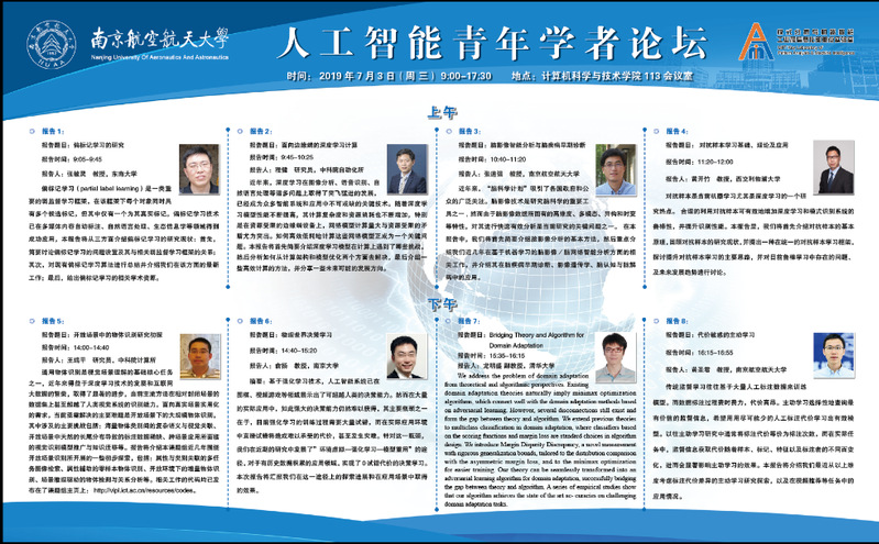 学院院长陈兵教授出席论坛并致辞欢迎。论坛邀请了东南大学张敏灵教授、中科院自动化所程健研究员、西交利物浦大学黄开竹教授、中科院计算所王瑞平研究员、南京大学俞扬教授、清华大学龙明盛副教授,以及我校张道强教授和黄圣君教授作主题报告。报告主题包括偏标记学习、深度学习、对抗样本学习、强化学习、迁移学习、主动学习等机器学习主流方向、以及人工智能芯片、物体识别、脑影像智能分析等。论坛吸引了校内外一百余人参加,并就相关问题进行了深入交流和讨论。