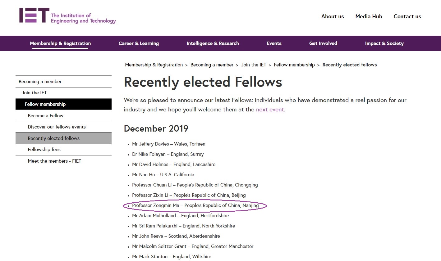 近日,经英国工程技术学会(IET,The Institution of Engineering and Technology)批准,英国上市公司365马宗民教授当选为IET Fellow (英国工程技术学会会士)。IET的会员类型分为荣誉会士、会士、专业会员、普通会员和学生会员。IET会士(IET Fellow)是IET学会的最高学术荣誉,授予在全球科学与工程技术领域展示出高度责任感并取得重要成就的杰出学者及专业技术人员。每年IET遴选约200名IET Fellow,其中中国内地入选者10-20名。