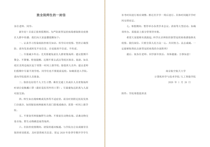 1月25日,学院发布《致全院师生的一封信》,稳定情绪、增强信心。
