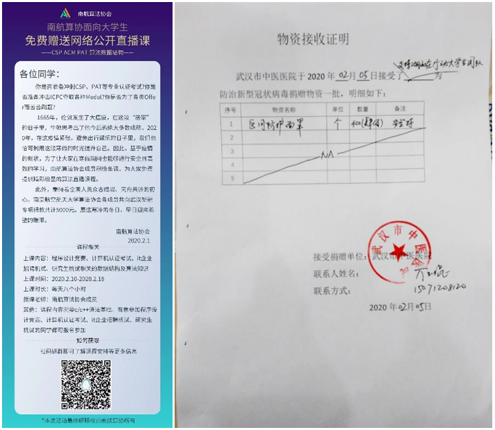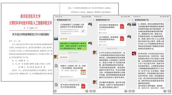 学院积极引导学生在疫情中弘扬正气、传递正能量,涌现出了一批抗“疫”典型:“支持湖北在行动大学生团队”为疫区募得善款2万余元,全部用于购买医疗物资;算法协会面向大学生免费提供课程,并自发向武汉新冠专项捐款5000元;学生们还通过书法、海报、视频、三行代码等多种形式表达对湖北的祝福和鼓励;疫情期间,学院数据管理与知识工程“五好”导学团队的导师们还专门制作了温馨视频发给学生,鼓励学生们珍惜时间、努力科研、共克时艰。