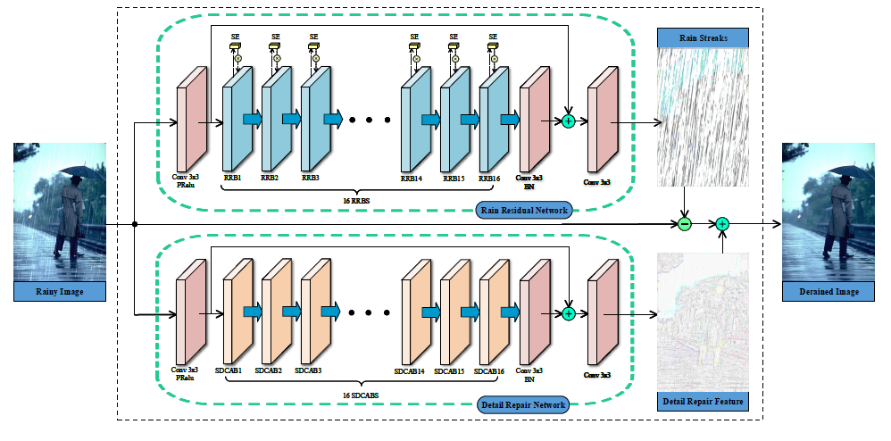 论文《Detail-recovery Image Deraining via Context Aggregation Networks》针对现有单幅图像除图像中雨线方法后图像细节丢失、纹理信息模糊等问题。首次提出采用双层并行网络来恢复去雨图像丢失的细节信息。与现有图像去雨工作不同,该方法将去雨和恢复细节视为并行独立的两个模块。一方面,去雨分支模块利用雨纹具有稀疏性这一先验性知识,采用SE(Squeeze-and-Excitation)模块对各个通道进行权重的分配,以此提取不同尺度雨纹特征。另一方面,细节恢复分支模块采取高感受野的空洞卷积模块和残差块相结合的方式,提取出丰富和多尺度的细节特征来恢复图像细节纹理信息。同时,该工作还提出了通用的细节恢复框架,该框架有助于提升现有其他图像去雨方法的图像去雨效果。实验证明该研究提出的模型在单幅图像去雨方面能够显著提高图像质量,让去雨后的图像具有更加丰富的细节纹理信息且更具有真实性。同时该方法在多个数据集上都优于现有的去雨方法。该方法解决了无人驾和户外监控系统的实际问题,有效的降低了雨纹对无人驾驶的行人物体检测识别造成的干扰,提升了行车安全性;同时降低了降雨天气户外监控图像产生畸变和模糊现象,提升了户外监控系统的有效性。