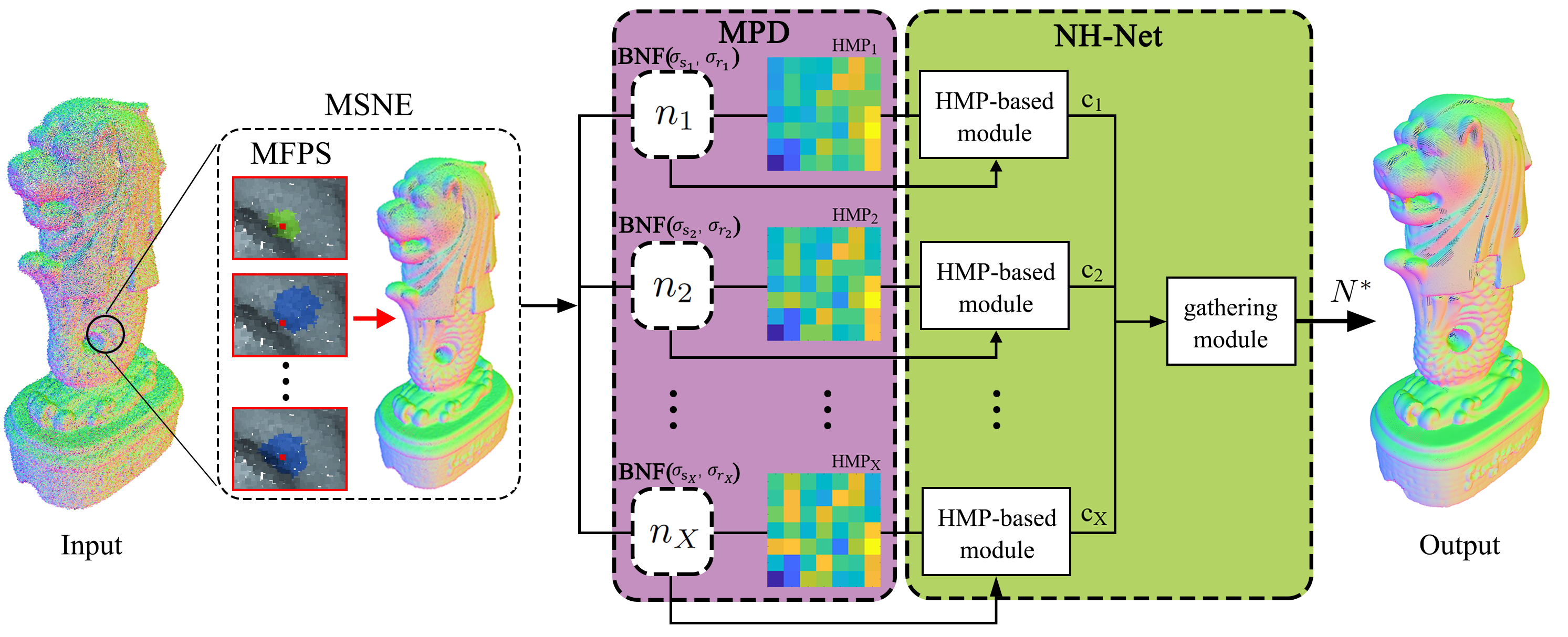 论文《Geometry and Learning Co-supported Normal Estimation for Unstructured Point Cloud》针对三维复杂点云的法向量估算问题,提出了一种几何领域知识 (Geometry Domain Knowledge) 和深度学习相结合的方法NH-Net,利用几何特征提升深度网络的学习能力。首先,提出了几何方法MFPS对原始点云进行特征提取和法向量预处理,强化了网络对于几何细节的感知能力。其次,首次将多尺度双边滤波后的法向量和高度图信息相结合,组成全新的特征算子进行学习。网络设计了一个新颖的多元聚合模块,使用变换矩阵对法向量进行修正,提高了网络的鲁棒性和保持特征的能力。该方法在合成、真实扫描和室内场景等多个公开数据集上进行了大量实验,实验结果证明NH-Net优于目前所有最先进的几何和深度学习同类方法。