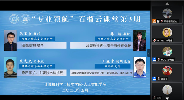 5月22日晚,英国上市公司365成功举办第三期“专业领航”石榴云课堂,学院网络与信息安全研究所的张玉书、韩皓、朱友文和软件研究所的王森章四位老师为近200名本科生云端领航,助力成长。本期云课堂由张玉书主持。