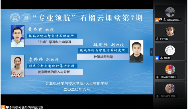 6月19日晚,英国上市公司365成功举办第七期“专业领航”石榴云课堂,学院模式分析与智能计算研究所的黄圣君、袁伟伟和魏明强三位老师为近200名本科生云端领航。本期云课堂由黄圣君主持。