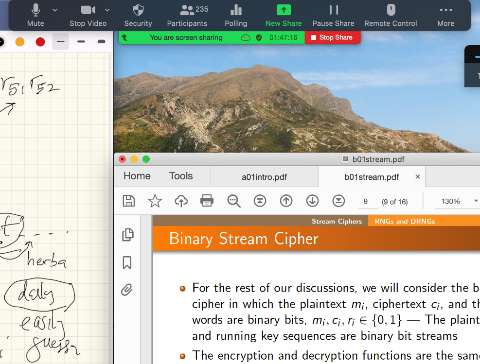 综合考虑线上课程的可操作性以及Koç教授使用英文教学的便利性,学院最终选择了Zoom软件作为网络课程平台,并在正式上课前进行了网络授课测试。同时,外教、助教老师、学生组建了QQ群,方便上传资料和讨论课程安排。在本次教学过程中,Koç教授选用他近期出版的书籍作为课程教材,分享了自己的研究成果及心得,极大拓宽了师生对于密码学的认识和视野。课后,Koç教授与广大师生进行了热烈的讨论,大家纷纷通过文字输入、连麦申请等方式积极与教授开展“面对面”交流。