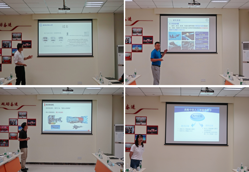 随后,刘学军/吕宏强团队介绍了近十年来在航空航天飞行器设计和空气动力学相关领域的AI交叉研究成果,其相关工作在国内甚至国际同行间均具有领先甚至超前十年以上的优势;黄圣君介绍了AI+智能发动机相关的交叉研究工作,通过利用主动学习、鲁棒学习、强化学习等智能手段控制发动机参数,可节省油耗20%以上,并得到合作单位的高度认可;魏明强介绍了与机电学院教授汪俊的合作团队在大型飞机自动化柔性测量与多源数据处理关键技术上的研究工作,尤其是在亿万级数据的快速处理上,不仅数据量不受内存空间的限制,处理速度也可达到秒级以内。以科研反哺教学、疫情期间被誉为网课女主播的袁伟伟老师分享了她将人工智能科研方法应用于教学的实践和探索,“让教学拥有一颗智能的心”折射出她在教学上的投入和钻研。支部的其他党员也各自分享了自己在AI交叉研究工作中的探索和实践,包括AI+健康,AI+航电,AI+无人机,AI+雷达,AI+材料加工等等。