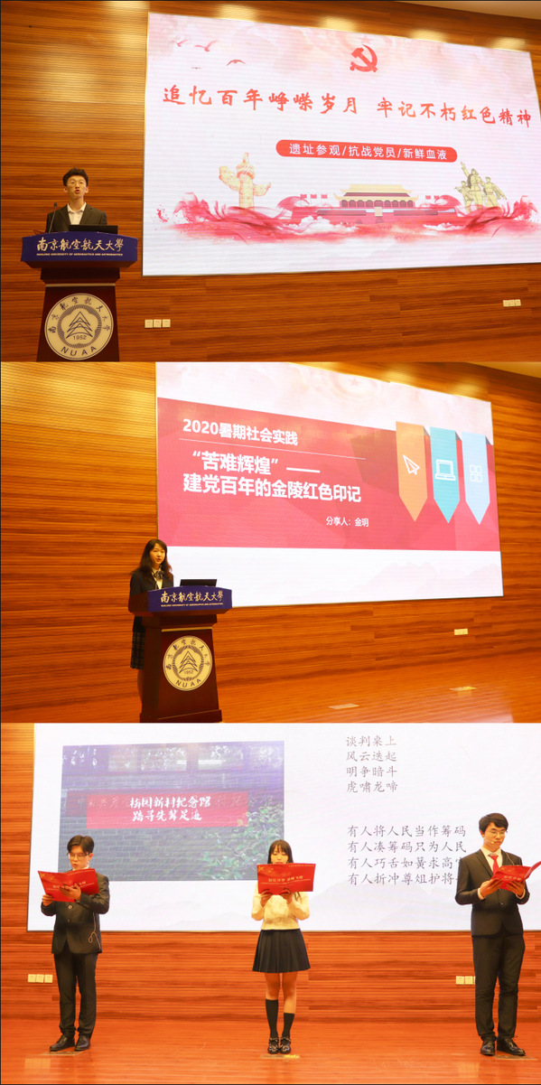 围绕“淬炼红心,牢记使命”主题。“追忆百年峥嵘岁月,牢记不朽红色精神”团队以线上线下相结合的方式参观红色纪念馆、走访新老党员,在不同的历史时期,新老党员的责任担当在历史交替和时间变化中永远延续着红色精神。“金陵红色印记”团队在南京寻访岁月长河里留下的红色印记,走访红色纪念馆,制作系列宣传讲解视频,旨在让更多青年学生了解老一辈革命家的英勇事迹,重温那段热血激昂的岁月。会上,团队成员围绕“雨花、梅园、渡江”三个主题朗诵了自创诗歌,为实践工作画上完美的句号。
