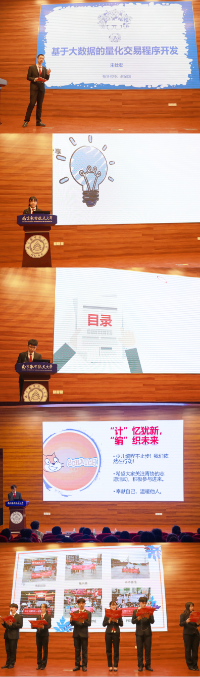 围绕“反哺社会,计算担当”主题。“基于大数据分析的量化交易程序开发”团队利用所学专业知识,初步尝试利用大数据分析的方法,对沪深两市的上市证券进行量化分析,研究量化交易策略,用所学专业知识回馈社会。“手拉手支教团”、“计忆犹新,编织未来”、“一款SaaS教务管理平台”三支团队,分别在西部支教、少儿编程、教务系统优化等方面进行了分享,他们为不同年龄、不同成长环境的青少年传递知识和温暖,体现了我院学子的社会使命感与责任担当。“助力‘地摊经济’,护航‘人间烟火’”团队深入调研家乡地摊经济情况,通过调研收集数据,制作了地摊经济评估模型,为家乡地摊经济保驾护航。