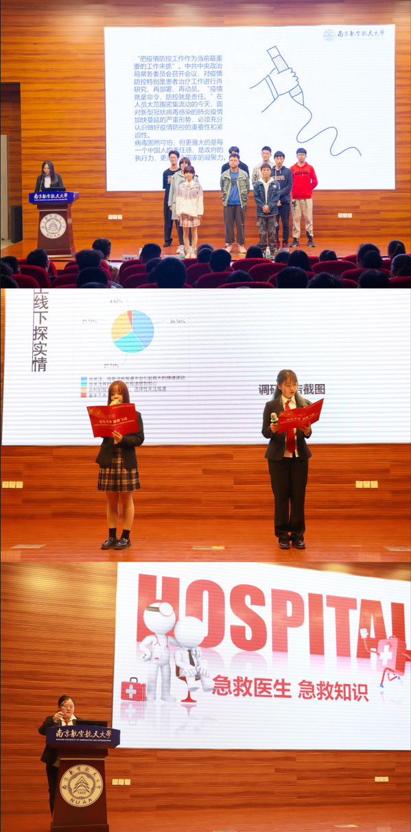 围绕“同屏共振,春回燕归”主题。“异域同心,以毅战疫”团队线上统计数据,线下收集抗疫故事,对比分析不同地区的抗疫举措,希望根据分析结果取长补短为全国的抗疫工作贡献自己的一份力量。“红心行动”团队从国民的心理健康入手,深入湖北荆州、潜江社区,了解当地社区居民心理健康状况、开展心理课堂、推送心理健康小贴士、牵手独居老人,在后疫情时代为社区居民提供多种形式的心理支持。“我国急救情况调研”团队通过了解120急救医生的工作状态,向现场同学传递了目前我国急救工作的基本情况,同时为同学们讲解了简单的急救知识。