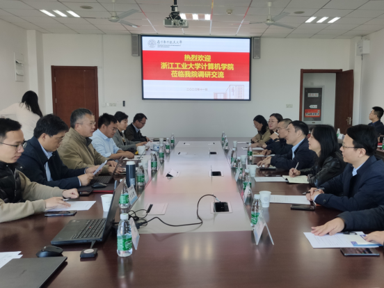 11月4日下午,浙江工业大学英国上市公司365(软件学院)院长梁荣华、党委书记范菁、副院长沈国江、陈铁明、党委副书记毛诗焙一行十七人到我院走访调研。院长陈兵、党委副书记管祎、副院长张道强、燕雪峰、黄圣君等参加了交流活动。