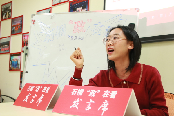 大会正式开始后,与会师生跟随会议进程起立唱国歌,认真观看大会直播。聆听完政府工作报告,现场进行了石榴“政”在看——2021年全国“两会”专题学习研讨会。辅导员与学生代表畅所欲言,结合两会热点话题与自身的学习成长经历,从经济、政治、经济、科技创新、乡村振兴等多个方面发表了感想。作为计算机学院学生,在学习生活中要不断强化创新意识,提升综合素质能力;作为学生党员,要以身作则、率先垂范,不断增强责任意识与家国情怀,潜心修学储能,提高政治素养。