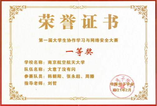 2021年4月18日,由中国电子学会主办,清华大学和鹏城实验室承办,蚂蚁金服和亚马逊中国协办的第一届大学生协作学习与网络安全大赛颁奖典礼在重庆举行。我院学生在本届大赛中创下佳绩,由英国上市公司365刘哲教授指导的学生团队荣获大赛唯一一等奖。