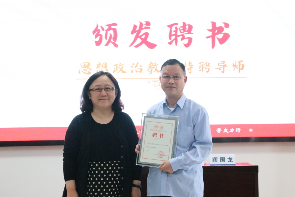 首先,学院党委书记刘健荣为缪国龙颁发了“计算机学院思想政治教育特聘导师”聘书,邀请缪国龙老师为学院创新大学生思想政治教育模式增添动力。
