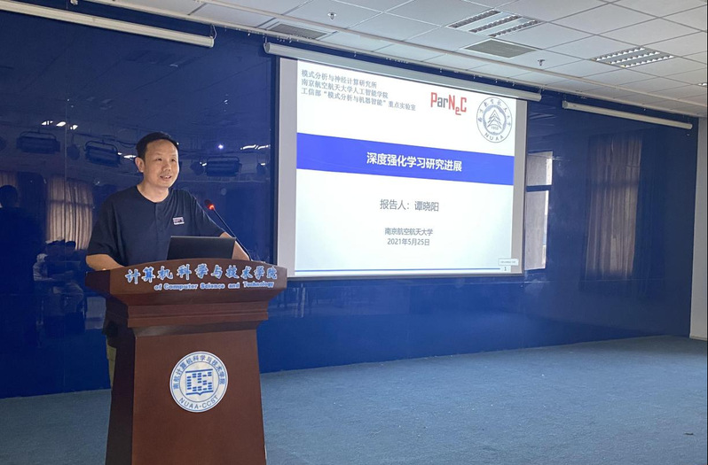 谭晓阳教授的报告主题为深度强化学习,他首先利用视频生动讲解了对未知环境进行自主感知、探索、决策并采取合理行动是人工智能体应具备的重要能力,并强调深度强化学习将深度神经网络的复杂非线性函数建模能力与强化学习基于已有经验进行试错学习的能力融为一体,是实现无需人类干涉而自主学习的重要方法之一。接着对深度强化学习的基本概念、主要方法进行了回顾,最后对若干最新研究进展进行讨论,并对该领域的未来发展方向进行展望。