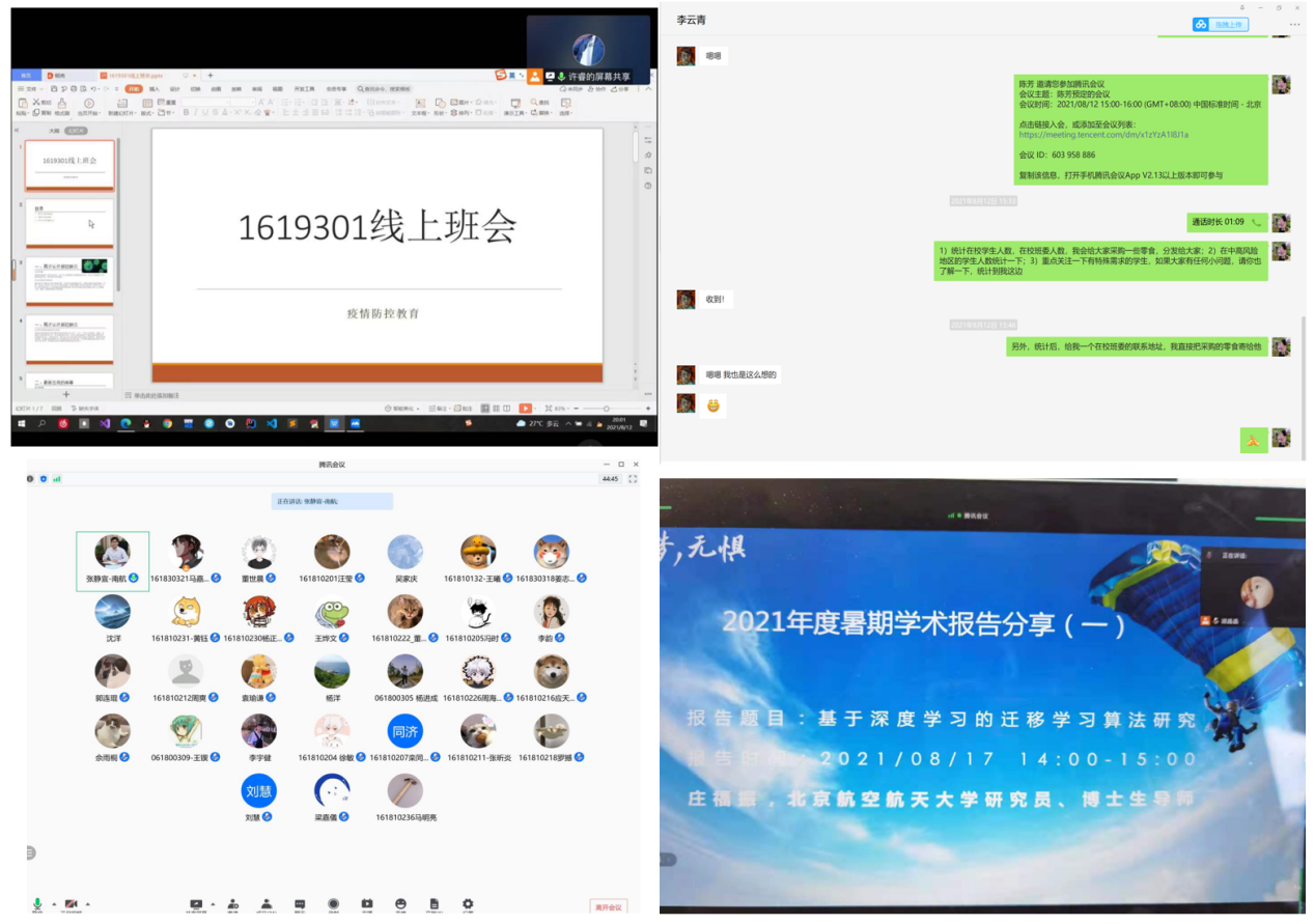 班会中,班主任要求同学们抗疫和提升能力两手都要抓。在近期,学院组织了多场线上学术交流讲座,这当中有科普性质的讲座,也有深入的学术研究报告,这些都向本科生同学们开放,可以满足大一至大三不同年级的学生需求。班主任顾晶晶老师更是在班会后邀请了北京航空航天大学的教授给班级同学们带来了一场精彩的学术报告,学生们纷纷反馈受益良多。通过特色的学术讲座活动的开展,让同学们“宅”的这段时间更加充实,不断开拓视野,提升科技创新能力,陪伴同学们一起成长。