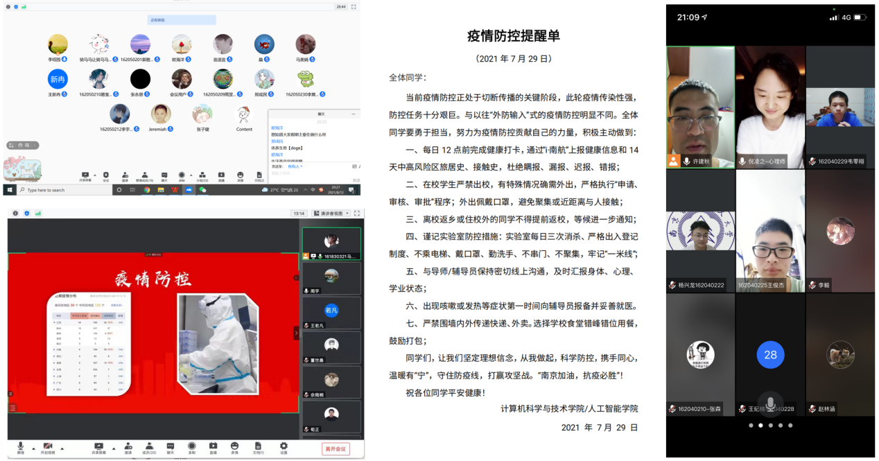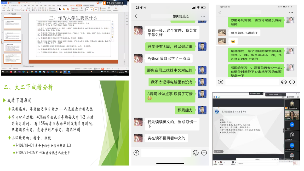班会中,班主任要求同学们抗疫和提升能力两手都要抓。在近期,学院组织了多场线上学术交流讲座,这当中有科普性质的讲座,也有深入的学术研究报告,这些都向本科生同学们开放,可以满足大一至大三不同年级的学生需求。班主任顾晶晶老师更是在班会后邀请了北京航空航天大学的教授给班级同学们带来了一场精彩的学术报告,学生们纷纷反馈受益良多。通过特色的学术讲座活动的开展,让同学们“宅”的这段时间更加充实,不断开拓视野,提升科技创新能力,陪伴同学们一起成长。