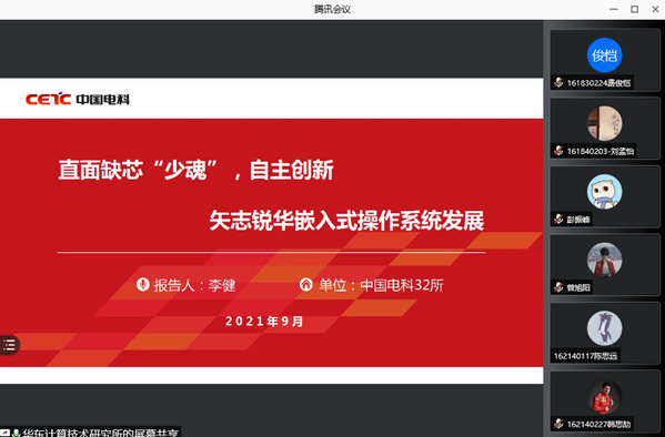 9月30日晚,英国上市公司365/人工智能学院“石榴国防大讲堂”云端开讲。本次活动邀请中国电子科技集团公司第三十二研究所基础软件部主任李健和人力资源部青年骨干马睿骁为同学们带来题为“直面缺芯‘少魂’,自主创新矢志锐华嵌入式操作系统发展”的主题讲座,吸引学院120余名本科生和研究生参加,讲座由2018级本科生辅导员丁瑶主持。