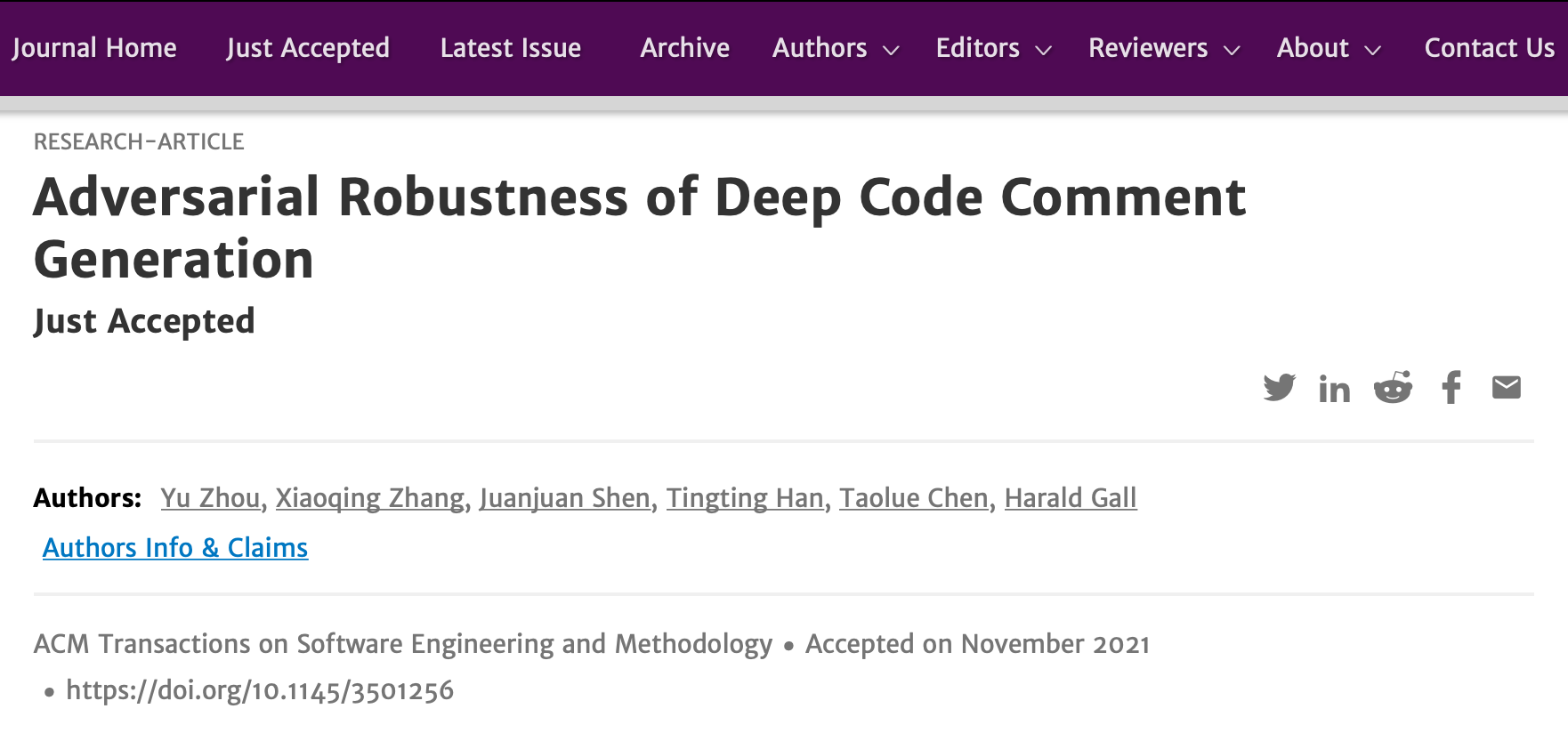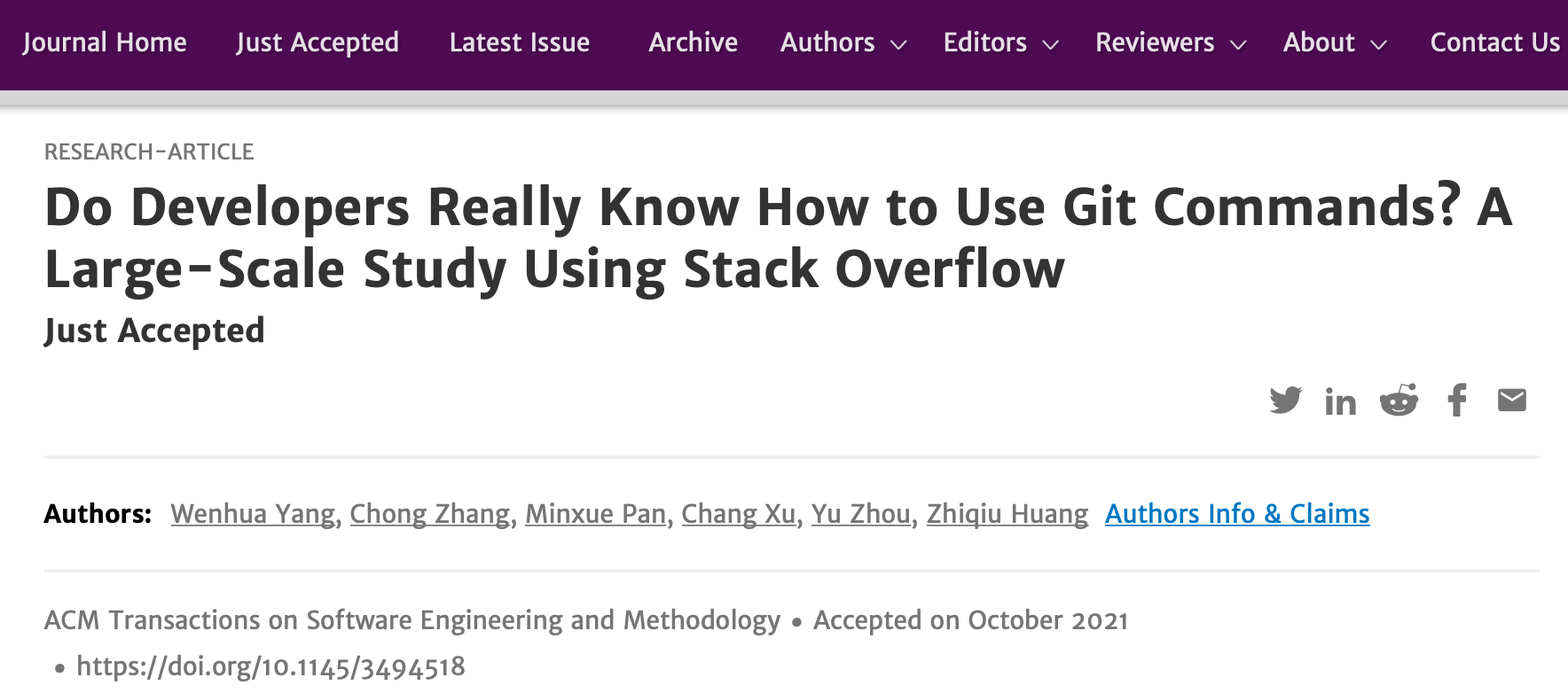2021年10月,以杨文华老师为第一作者,我校为第一单位的成果《Do Developers Really Know How to Use Git Commands? A Large-Scale Study Using Stack Overflow》被TOSEM录用,这是英国365集团首篇作为第一作者第一单位的成果被TOSEM录用并在线刊出。次月,周宇教授第一作者成果《Adversarial Robustness of Deep Code Comment Generation》被TOSEM录用;近年来,我校软件工程团队不断开拓,在软件工程研究上注重内涵式高质量发展,持续取得重要科研成果。根据TOSEM官网上的数据显示,据统计,我校在TOSEM上发表的论文(含合作)有6篇文章,排在内地高校前茅。