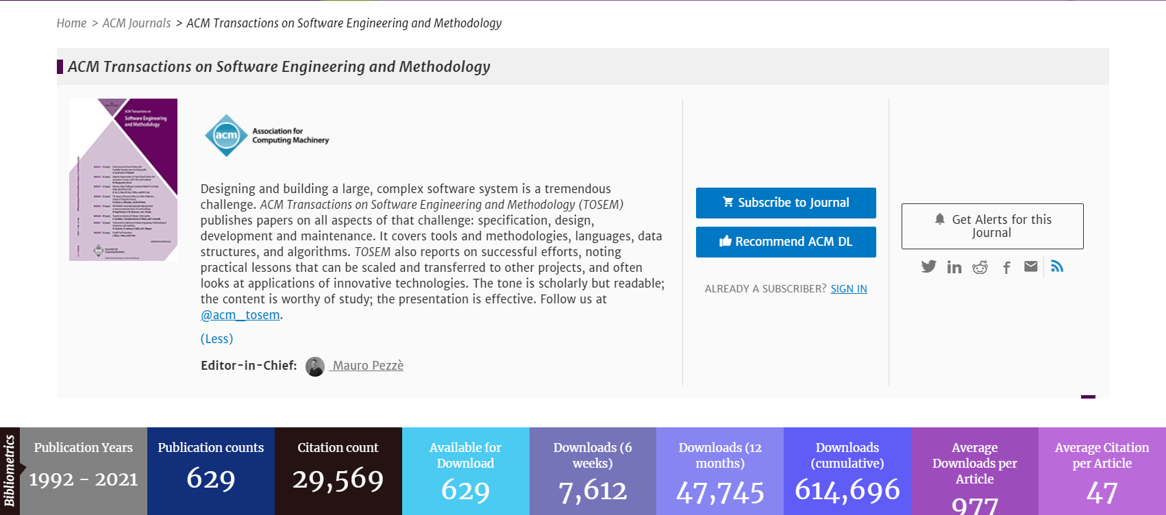 近期,我院软件工程团队2项成果被软件工程国际顶级期刊ACM Transactions on Software Engineering Methodology (TOSEM) 录用并在线刊出。TOSEM是国际上公认的最权威、最高水平的软件工程领域顶级期刊之一,也是软件工程领域仅有的两个CCF A类国际期刊之一。每年1卷,每卷4期,30年(1992-2021)共计收录论文629篇,年均接收文章仅20余篇,录用率极低。