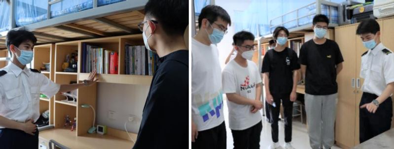 学院2021级全体宿舍长参与了本次参观学习活动。根据疫情防控要求,本次参观共分6个批次进行,每一批次下分四个小组,由小组长带队前往指定的飞行员宿舍进行参观学习。准军事化管理下的飞行员宿舍内务让同学们眼前一亮,方方正正的被褥、整齐有序的物品摆放等都引发了宿舍长们对内务整理的思考。