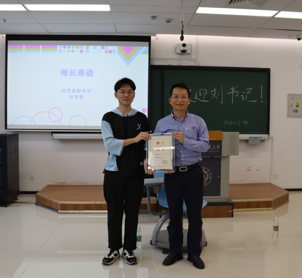 自由交流环节后,刘宇雷从学长的角度出发亲切寄语到场学生,他倡导同学们首先要将小我融入大我之中,在实现中华民族伟大复兴的赛道上奋勇争先,用实际行动践行“以AI技术赋能强国之路”的班级愿景;其次要有高境界和大格局,把眼光放长远,不做精致的利己主义者;最后作为新时代中国青年,还要有斗争精神,敢于迎难而上,拒绝“躺平”。活动中,1621001团支部聘请刘宇雷书记担任团支部的团建指导员,为团支部建设及思想引领工作指点迷津。