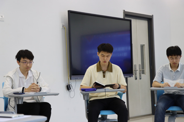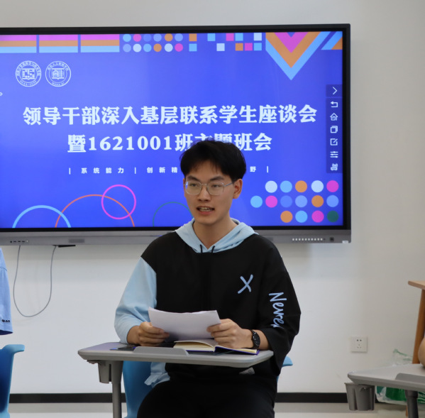 之后,班级学生代表与各位老师进行了自由交流,大家踊跃发言,现场热闹非凡。学院科技创新类社团—极客俱乐部的干事杨幸龙同学分享了自己在天目湖校区的科创体验,并介绍了极客俱乐部开展的系列科创活动。徐敬同学分享了自己参加《基于深度学习的图像分割技术》自由探索项目的心路历程以及未来的科创规划,表达了自己为科技强国建设贡献力量的决心。陈子上同学结合自己的兴趣爱好以及在乐队的演出经历,为校区文艺演出场地的规划建设提出了自己的建议。