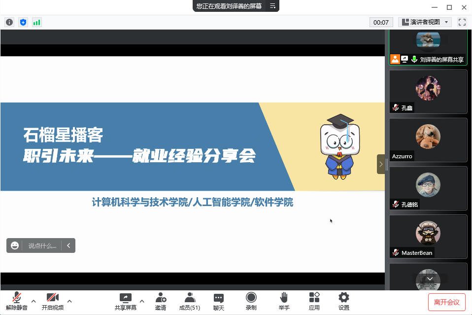 为提升研究生职业生涯规划意识,找准自身定位,7月17日晚,计算机学院邀请2019届硕士毕业生范欣然、徐婧和2020届硕士毕业生李星罗举办“职引未来--就业经验分享会”。本次分享会通过腾讯会议以线上方式进行,由硕士研究生辅导员刘译善主持,学院2023届硕士研究生参加。
