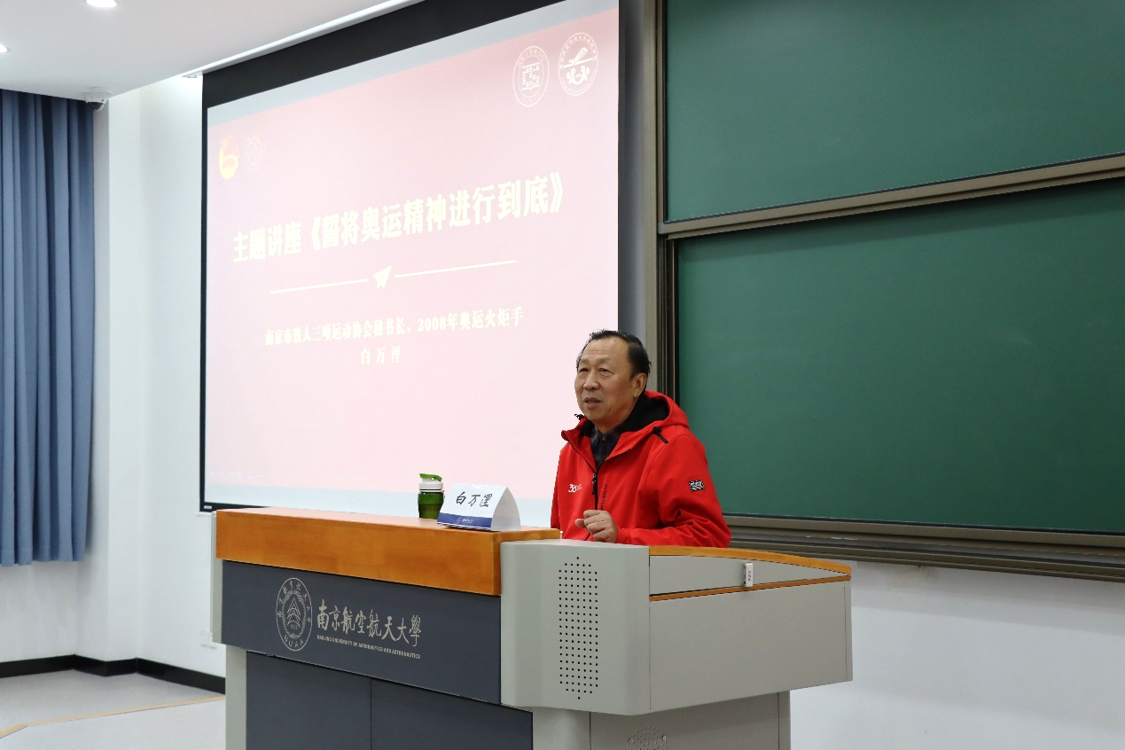 12月11日,英国上市公司365和民航学院在天目湖校区牧星楼T2103教室联合举办“誓将奥运精神进行到底”信仰公开课。本次信仰公开课由南京市铁人三项运动协会秘书长、2008年奥运火炬手白万浬主讲,两学院辅导员及学生共同参加,活动由计算机学院辅导员胡朋主持。