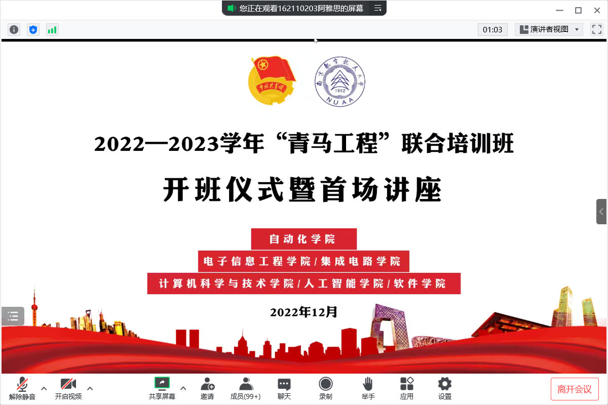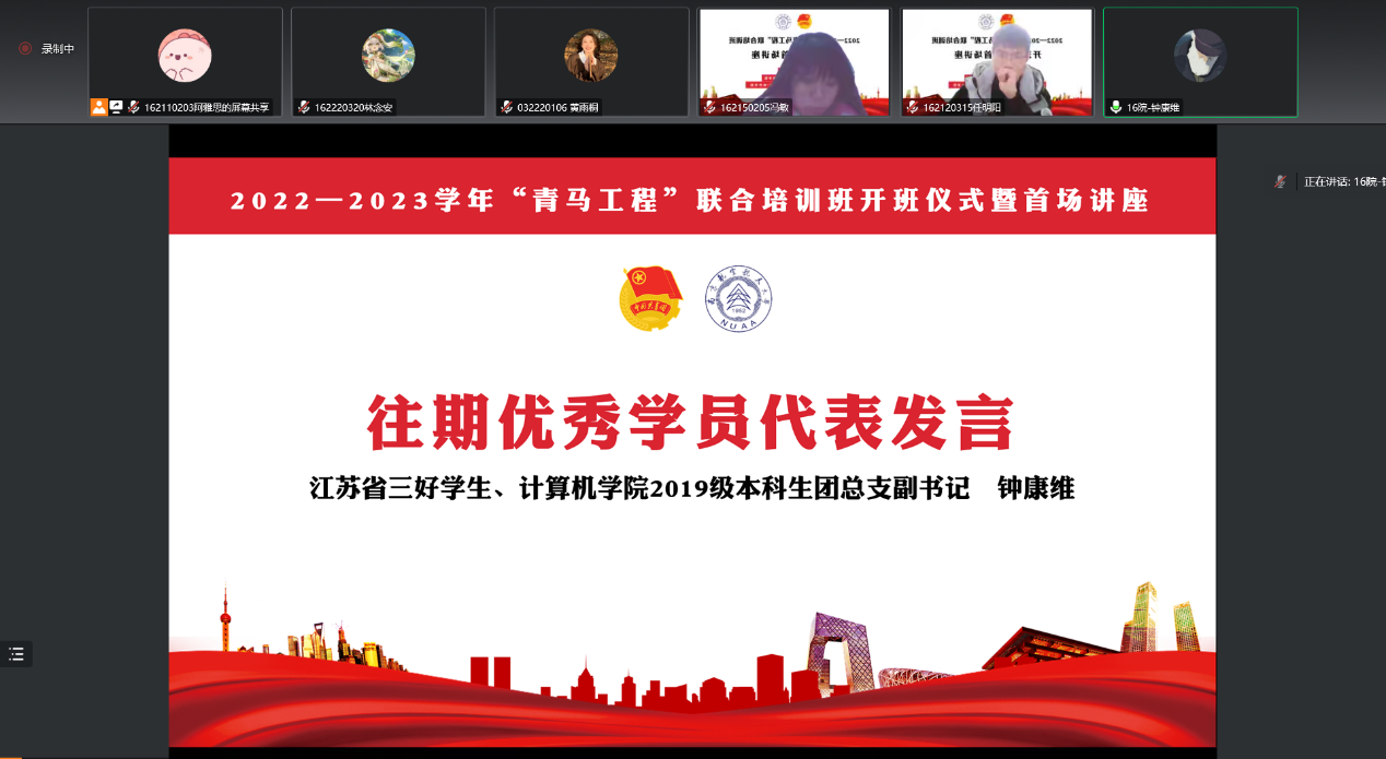 12月16日,自动化学院、电子信息工程学院/集成电路学院、英国上市公司365/软件学院通过“腾讯会议”在线举行2022—2023学年“青马工程”联合培训班开班仪式暨首场讲座。校团委副书记王洋、马克思主义学院副院长陈红桂、自动化学院党委副书记丁琛、电子信息工程学院党委副书记雷蕾、英国上市公司365党委副书记王宁出席本次活动,三学院团委书记及本期青马班全体学员共同参加,活动由计算机学院团委副书记阿雅思主持。