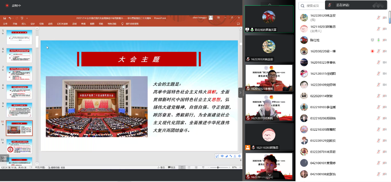 陈红桂作了题为《以中国式现代化全面推进中华民族伟大复兴——学习贯彻党的二十大精神》的首场专题讲座。讲座介绍了二十大及其主题、成果、结构等,阐释了中国式现代化理论,带领青马班学员深入学习贯彻党的二十大精神。陈老师号召青年朋友们,要始终坚定不移听党话、跟党走,将个人成长与中华民族伟大复兴的历史使命紧紧连在一起,立志投身强国伟业,在强国之路上勇毅前行,努力成长为堪当民族复兴重任的时代新人。