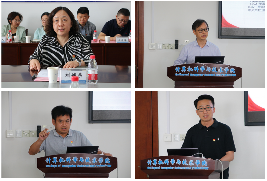 在重点发言环节,计算机学院副院长张道强从扎根中国大地办教育、构建有中国特色中国风格中国气派的科研体系、坚持人民至上等方面畅谈了对科教兴国战略的理解;自动化学院党委委员、院长助理李韪韬从教育公平、有组织的科研、坚持党管人才等方面分享了读书感悟;计算机学院党委副书记王宁将研读专题摘编的收获与党的二十大精神学习相结合,分享了在弘扬伟大建党精神、践行初心使命等方面的体会;自动化学院院长助理朱永凯从聚焦科教兴国践行民主党派担当、坚持创新驱动贡献一线教师力量交流了自己的工作思考。