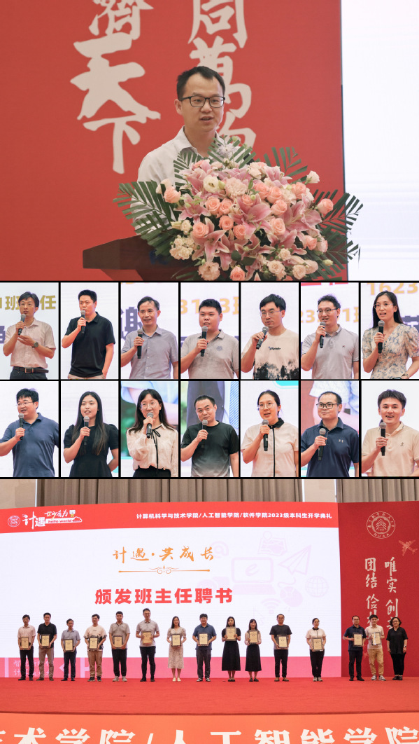 李鑫宣读了计算机学院2023级本科生班主任名单,新生班主任依次发言,寄语新生,鼓励大家在日后的学习生活中不畏挑战,勤于思考。刘健荣为2023级本科生班主任老师颁发聘书。