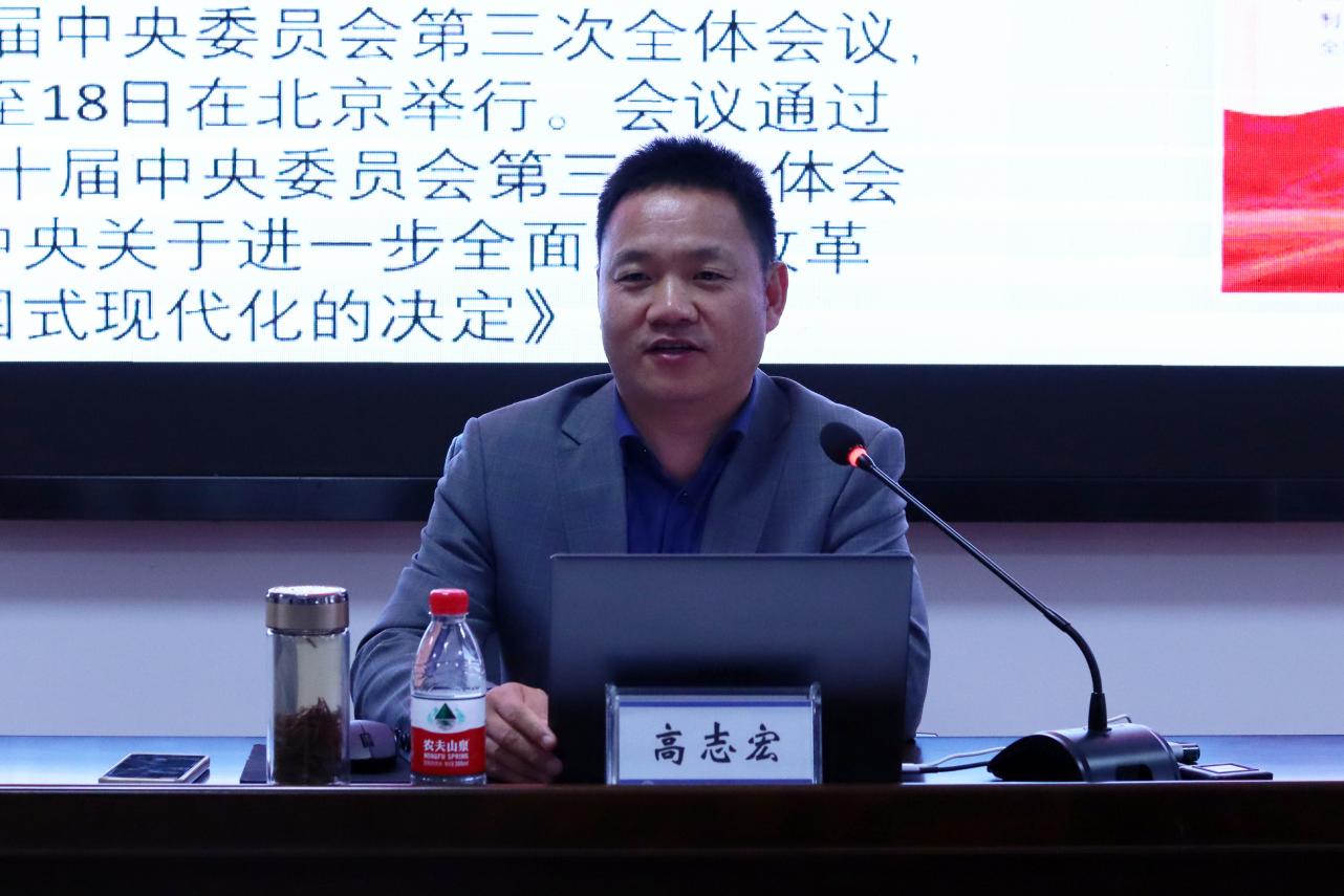 高志宏从回顾党史上的三中全会引入,紧扣党的二十届三中全会精神,围绕习近平总书记在党的二十届三中全会上的重要讲话和《中共中央关于进一步全面深化改革、推进中国式现代化的决定》主要内容,提出“为什么改”“改什么”“怎么改”,对全会精神进行了全面宣讲和深入解读。对于全会精神在学校、学院的贯彻落实,他强调,改革的成功并非易事,要以功成不必在我的精神境界和功成必定有我的历史担当,一张蓝图绘到底,一茬接着一茬干,求真务实,真抓实干,做到“抓铁有痕”“踏石有印”,以实绩实效和师生满意度检验改革。