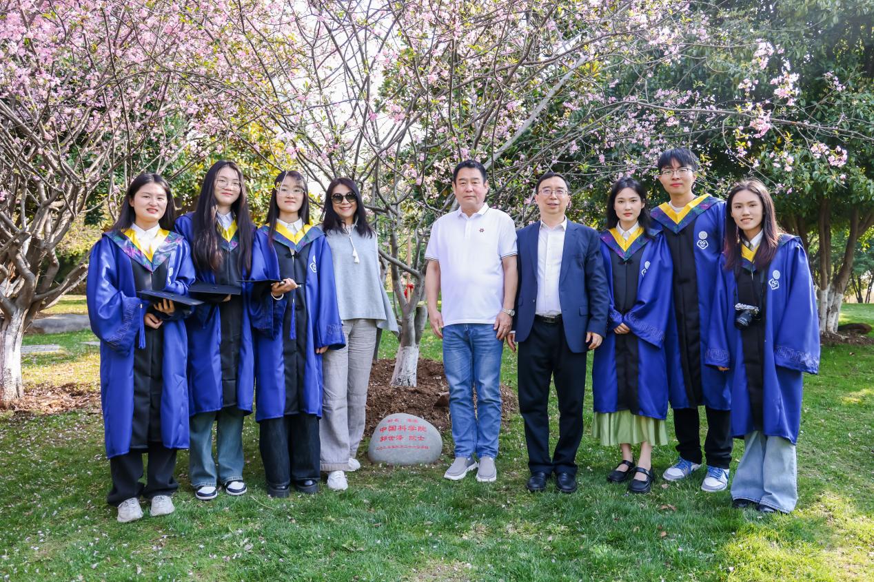 会议开始前,郭世泽院士参观砚湖边“问天鼎”,与师生代表共同在“院士林”植树培土。