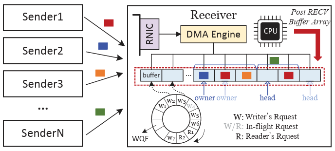 论文发现现有分布式系统的同步源语在用户请求排序和所有权转移两方面存在严重的性能问题,导致网卡资源竞争以及网络拥塞,难以发挥底层高性能RDMA网络低延迟、高带宽的优势。论文通过分布式锁协议-RDMA网络的协同设计,提出一种新型的流式同步源语抽象。该系统抽象主要包括:(i) 基于现代网卡的共享接收队列特性提出可扩展的请求排序机制;(ii) 提出一种基于点对点通信的所有权转移机制。对比现有基于RDMA网络的分布式同步源语,论文方法在并发控制和系统扩展性方面展现出较大优势。